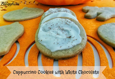 cappuccino mix, white chocolate and the rest list of ingredients are all items you probably have in your pantry and refrigerator. I can see myself making these again and again. Because I was making them for a Halloween cookie care package for my college daughter, I cut them out in cat and pumpkin shapes along with the round ones. She is going to love them as she is a huge coffee drink and a cookie lover! I dusted a few with cinnamon but you could also use unsweetened cocoa powder too.