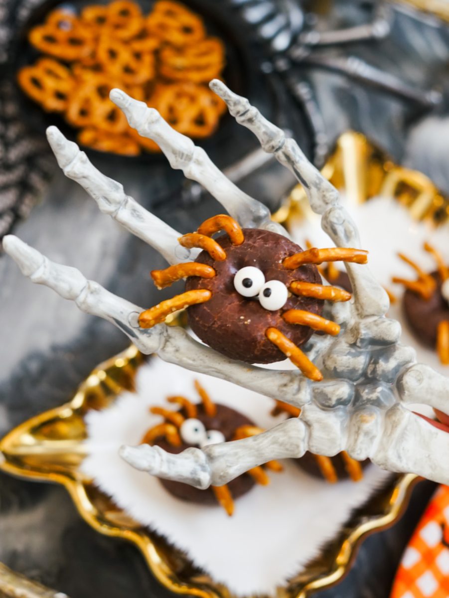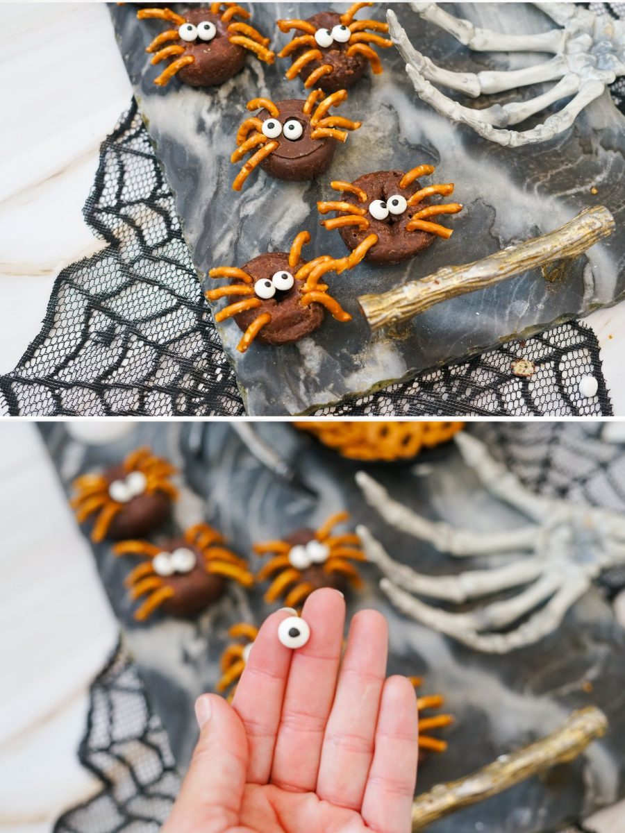 - Snap the pretzels into small pieces to form the legs, then press them into the sides of each donut. You need 8 pieces for each spider.Add two candy eyes on top, pressing gently to secure. If they don’t stick, use a tiny dab of frosting or melted chocolate as glue.