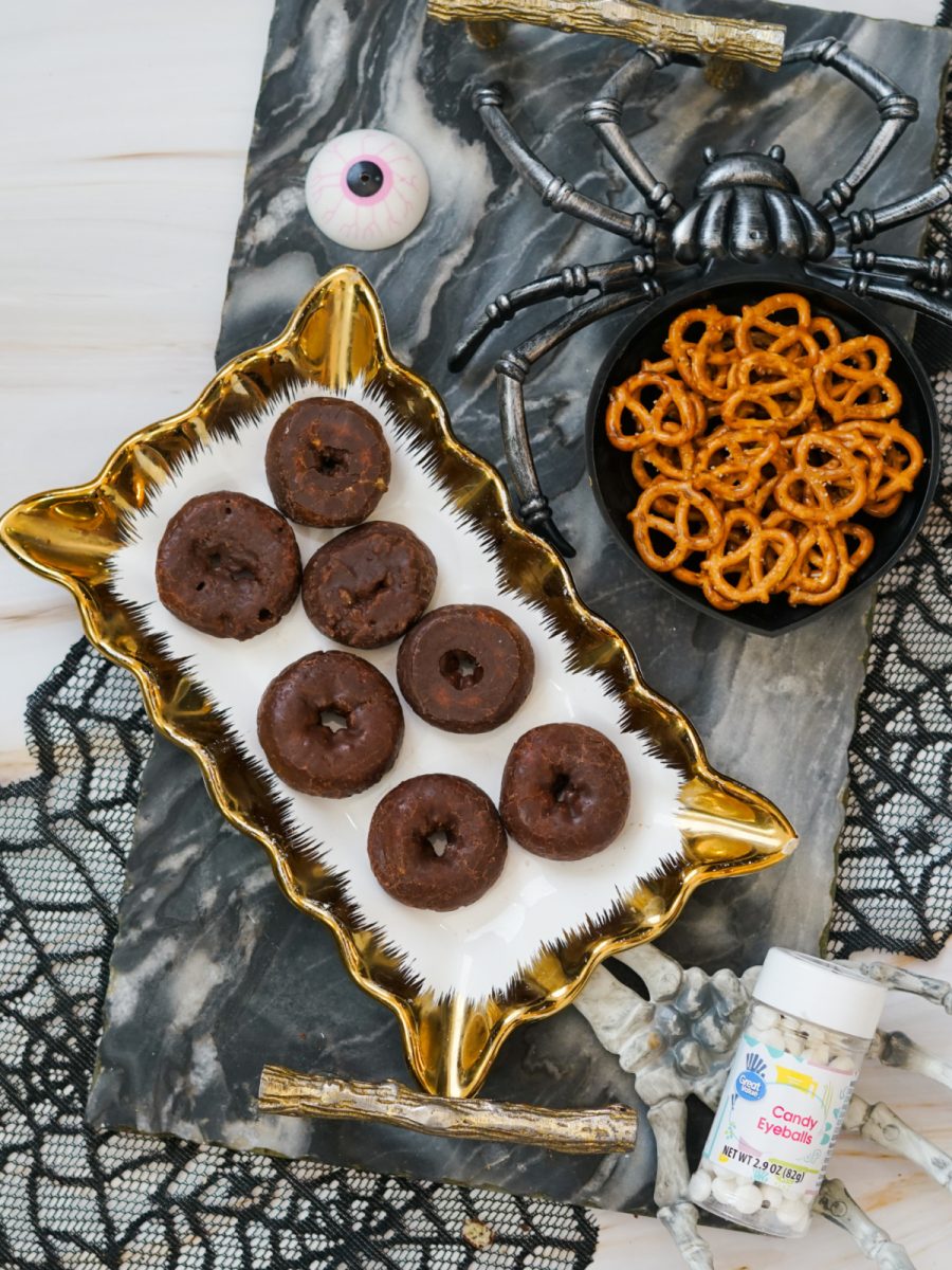 Break the pretzels into pieces to create spider legs. Stick the pretzel pieces into the sides of the donut. Place two candy eyes onto the donut. I just pressed slightly to get them to stick. If it’s not working for you, dab a tiny amount of either frosting or melted chocolate to act a glue. Repeat for each mini donut.